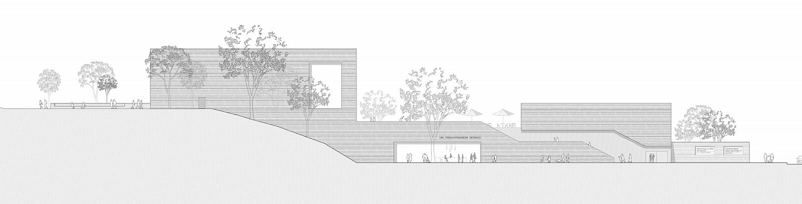 Das Eingangsgebäude an der Landstraße nach Detmold gibt dem 11m höher gelegenen Freilichtmuseums erstmals eine sichtbare Adresse. Parallel zu der benachbarten barocken Gartenanlage schiebt sich der terrassierte Bau tief in den Hang und verbindet mit Stützmauern, Freitreppen und Terrassen drei Niveaus im Innen- und Außenraum. Während das Foyer und der ins Gelände eingeschnittene Ausstellungsraum vom Vorplatz an der Straße zugänglich sind, greift die öffentlich zugängliche Museumsterrasse, die über eine Freitreppe erreicht werden kann, das Terrassenniveau des Barockgartens auf. Von dort führt eine Rampe hinauf zum Niveau des Freilichtmuseums, von dem auch die Museumspädagogik zugänglich ist.