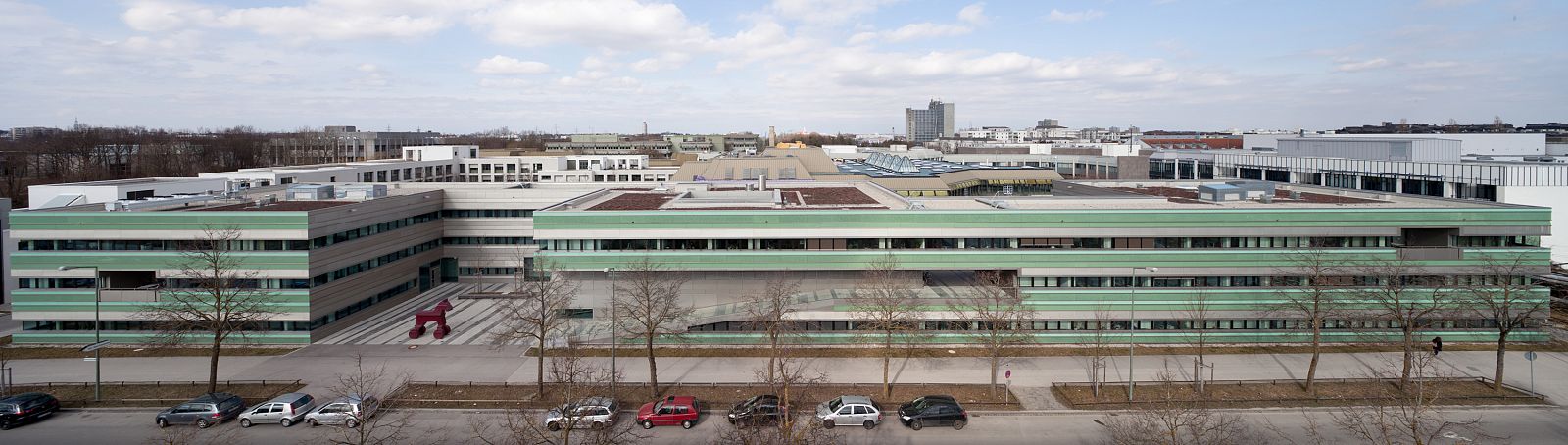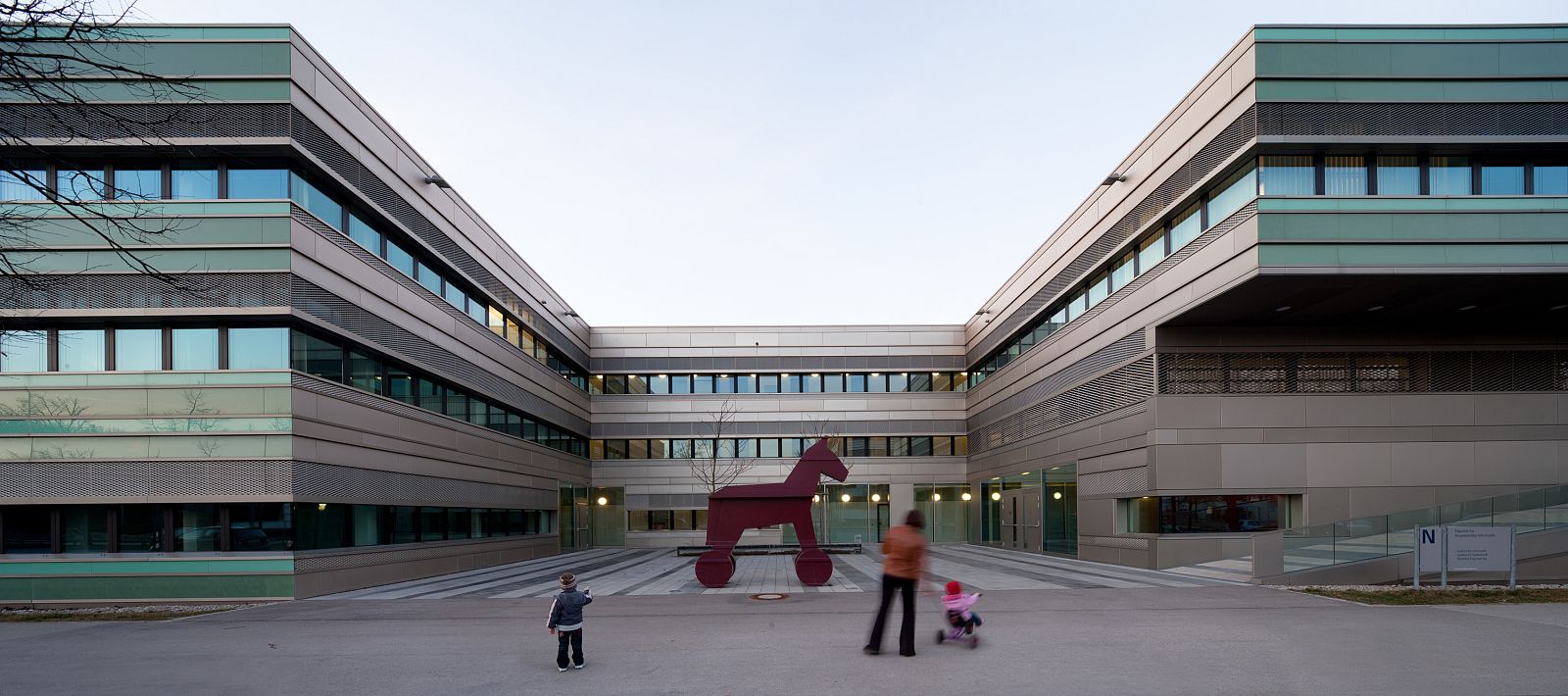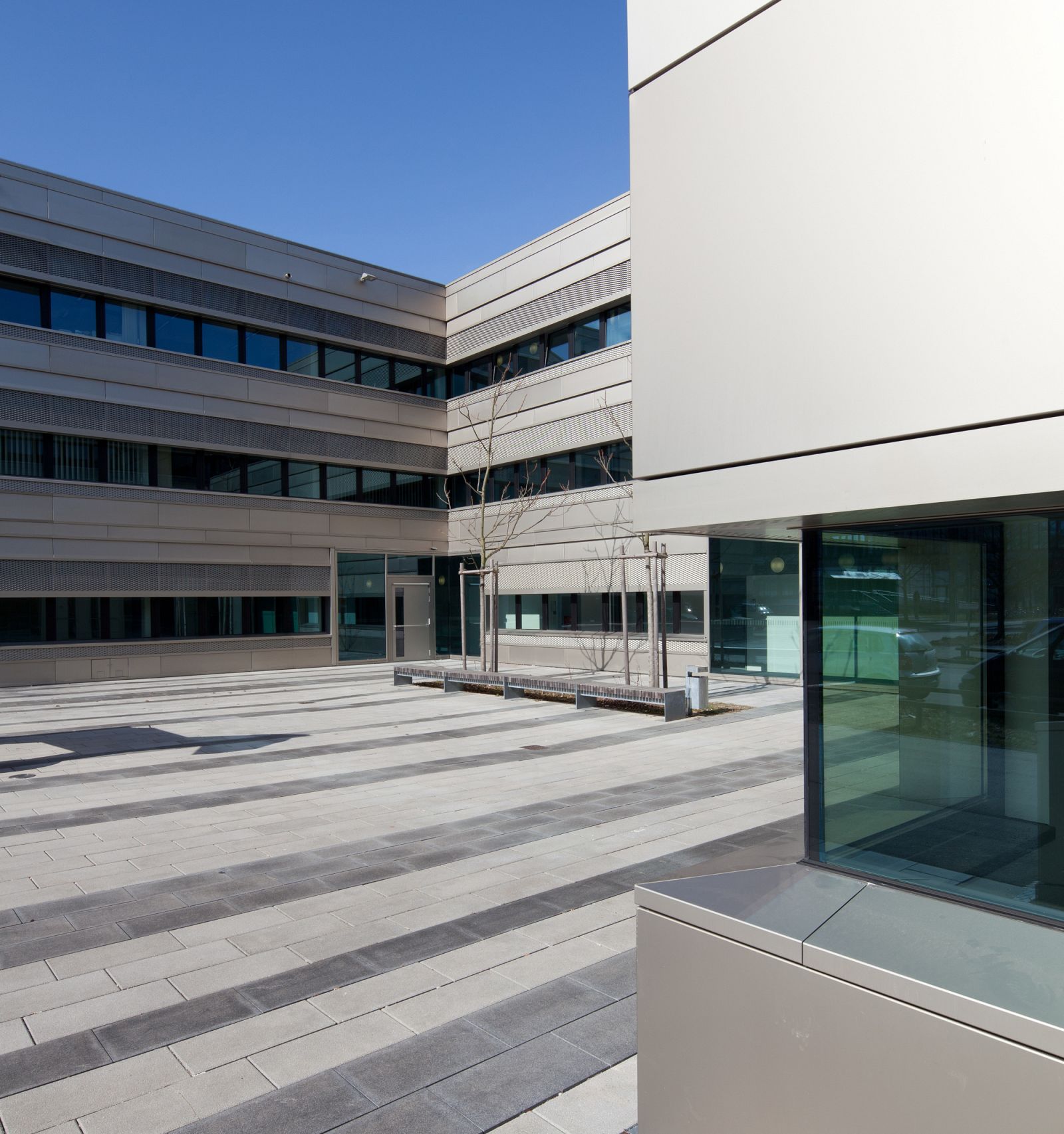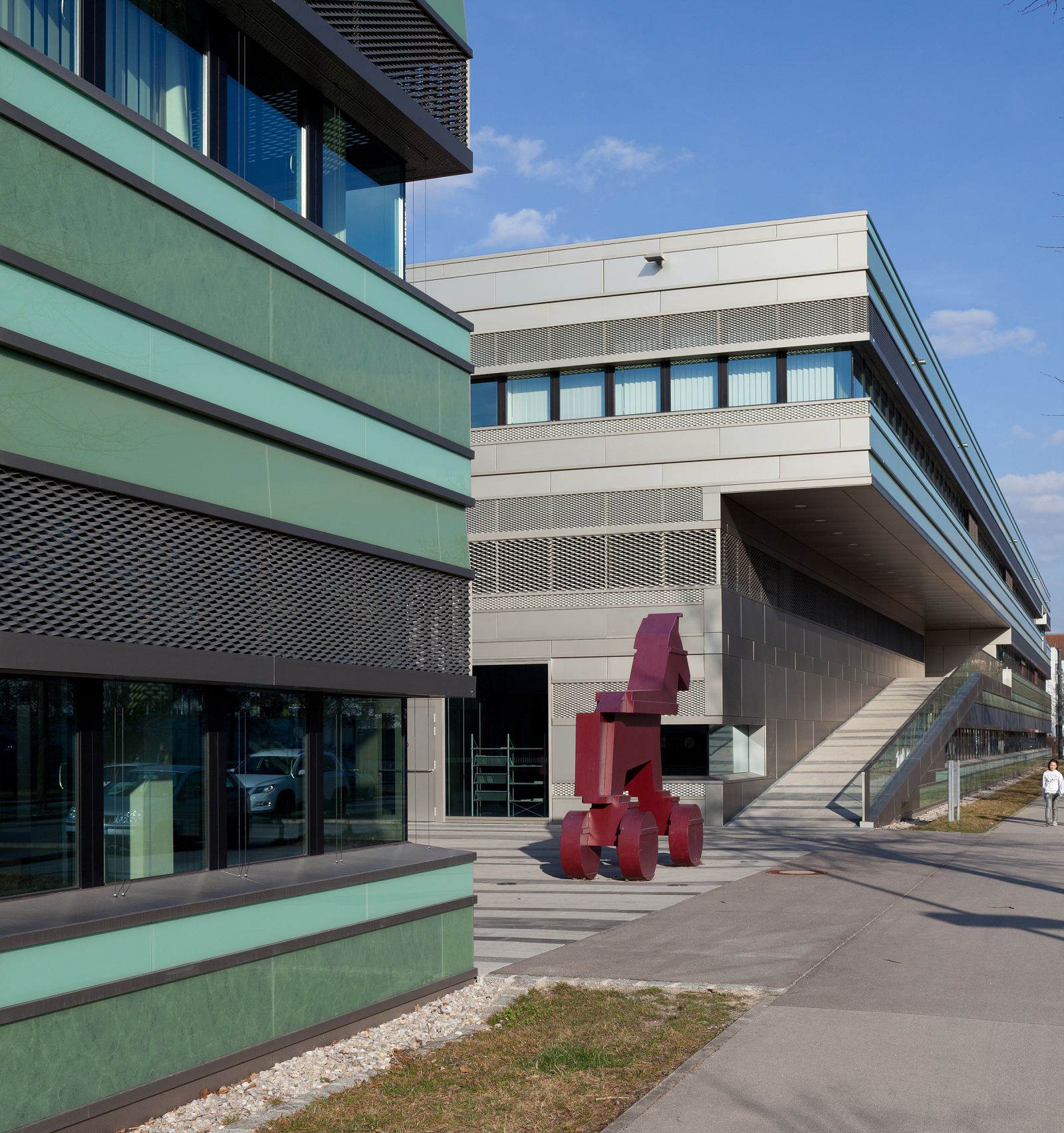 A public footpath that leads straight through the building has now redefined pedestrian circulation on the campus. The result is an architectural ensemble that creates not only an organisational cross-link with the southern part of the campus, but also a spatial connection. The oblong building is arranged around two courtyards: one is the actual forecourt while the other, located on Level +1, creates space to the rear of the dining hall and connects to it via a bridge. The embedding of the building in its urban context unfolds an organisational logic in the interior as well. The two courtyards carved out of the building block divide it into various sub-centres as organisational units for the various university departments. The most public part of the institute is located in the centre of the building – the multimedia lecture hall. The one-storey offset of the two exterior courtyards, which are linked through the ramp system of the public footpath, is achieved through the rising tiers of the auditorium inside.