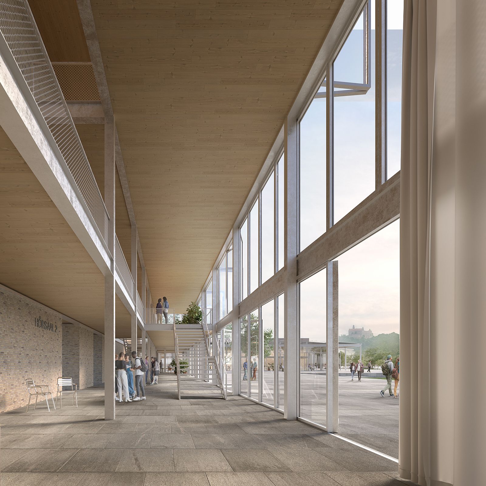 Designed as showcases of university life, these buildings face the central outdoor spaces of the campus, infusing them with vitality.